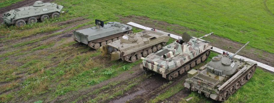 На нижнем фото вы видите: БТР, МТЛБ, БМП, танк ПТ-76, танк Т-55 все они находятся недалеко от С-Петербурга и ждут вас на катания.